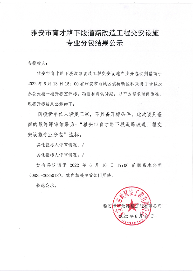 雅安市育才路下段道路改造工程交安設(shè)施專業(yè)分包結(jié)果公示