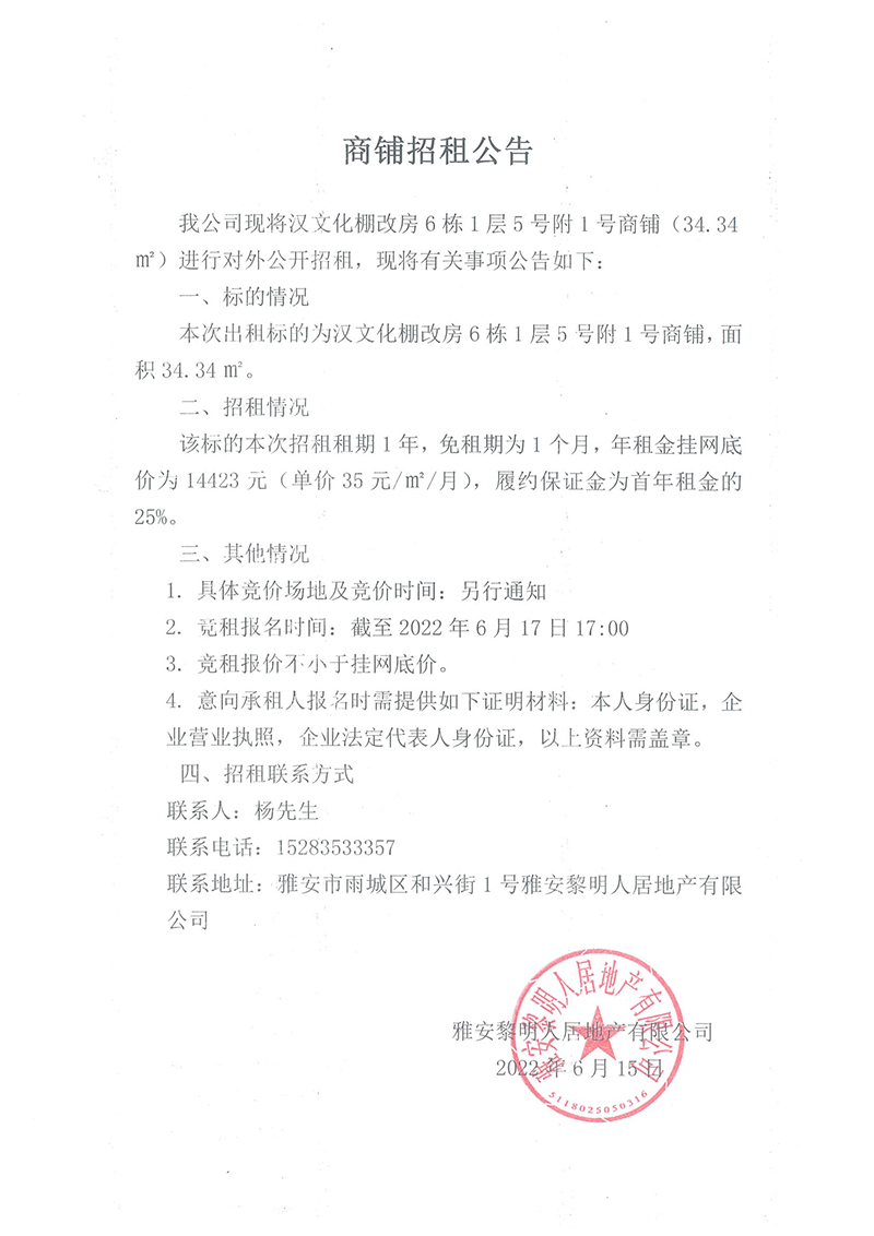 漢文化棚改房6棟1層5號附1號商鋪招租公告
