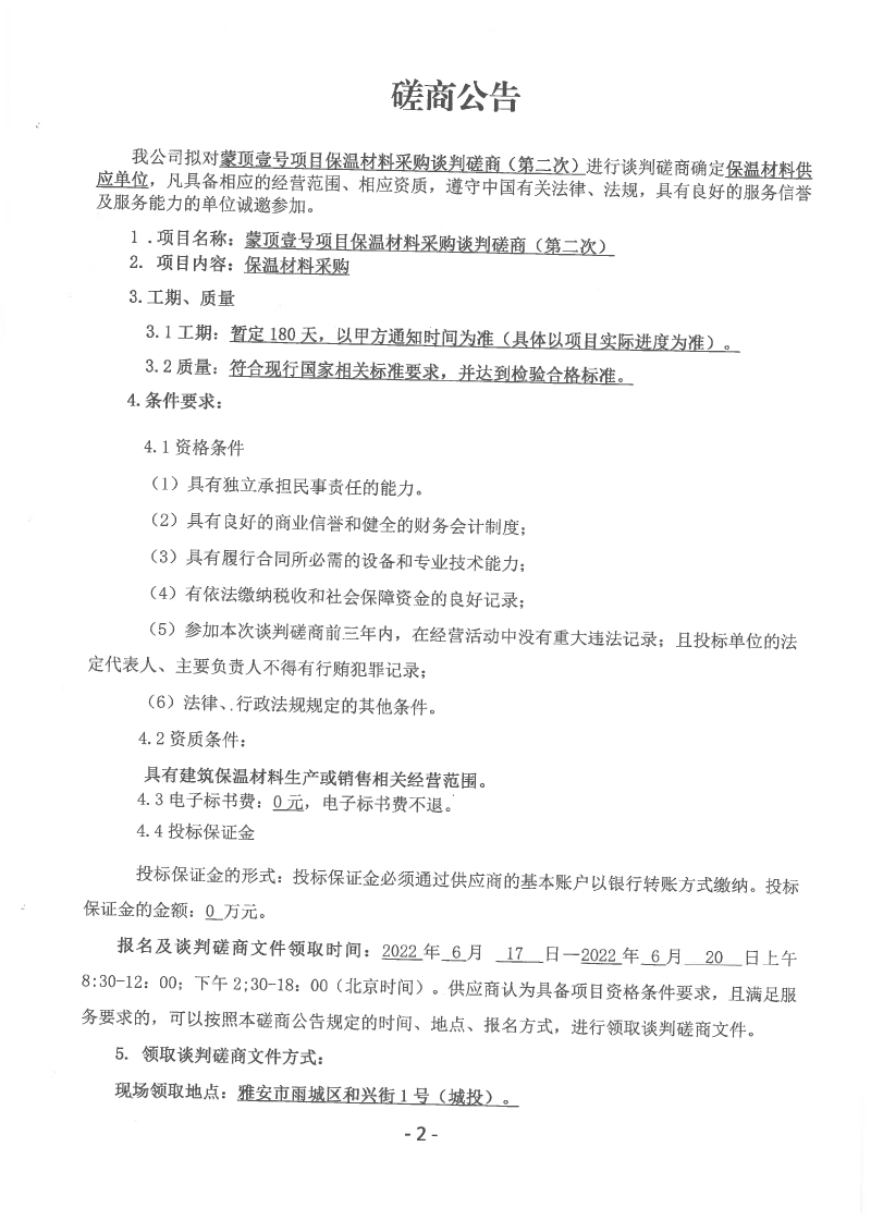 蒙頂壹號項(xiàng)目保溫材料采購談判磋商(第二次)公告