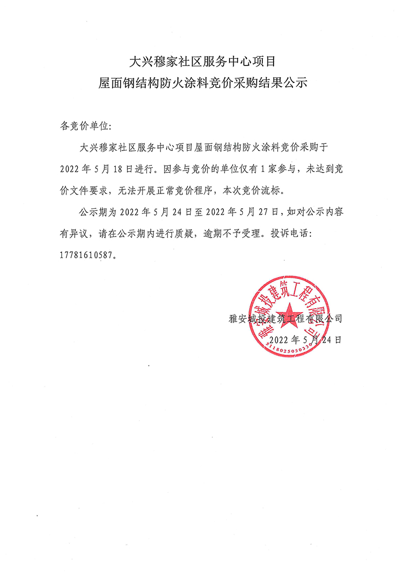大興穆家社區(qū)服務(wù)中心項目屋頂鋼結(jié)構(gòu)防火涂料競價采購結(jié)果公示
