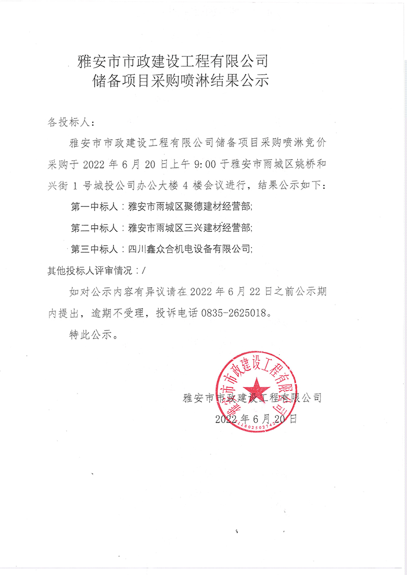 雅安市市政建設(shè)工程有限公司儲備項目噴淋系統(tǒng)結(jié)果公示