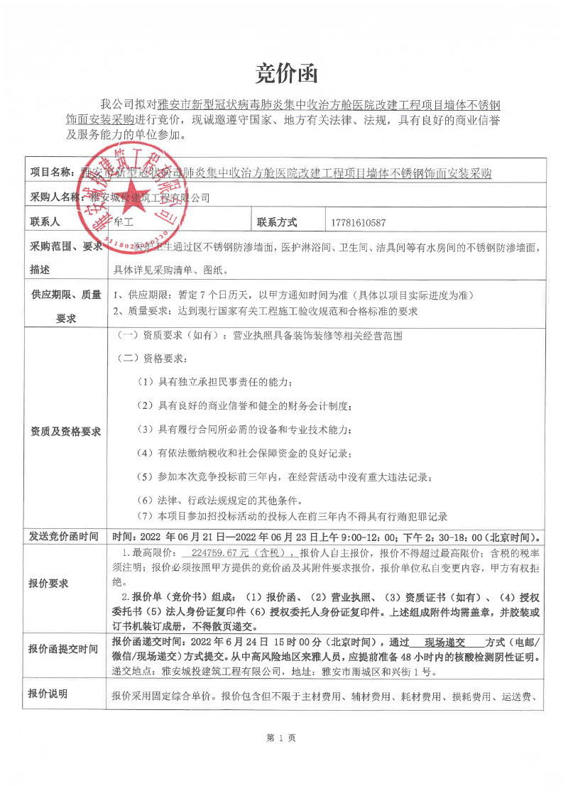雅安市新型冠狀病毒肺炎集中收治方艙醫(yī)院改建工程項(xiàng)目墻體不銹鋼飾面安裝采購競價公告