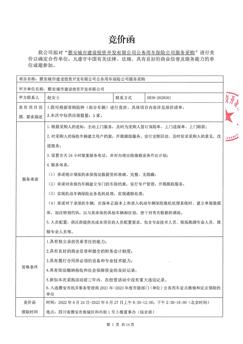 雅安城市建設(shè)投資開(kāi)發(fā)有限公司公務(wù)用車(chē)保險(xiǎn)公司服務(wù)采購(gòu)競(jìng)價(jià)公告