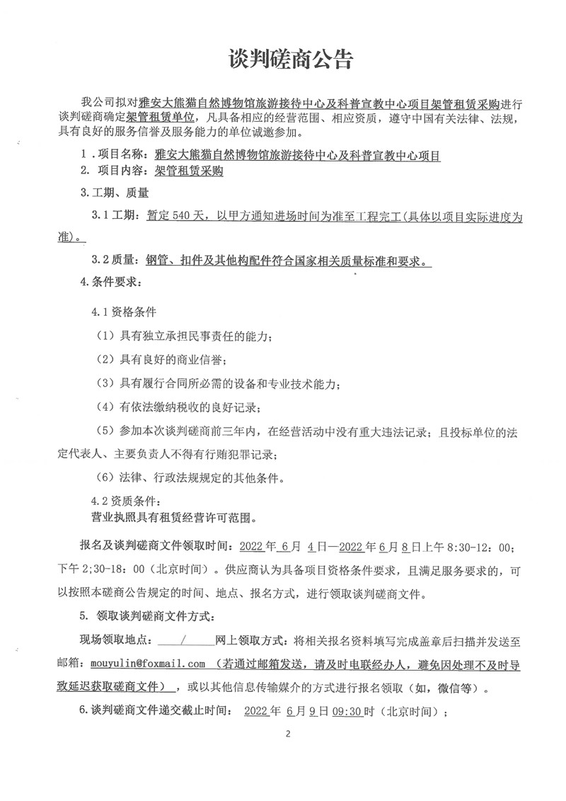 雅安大熊貓自然博物館旅游接待中心及科普宣教中心項(xiàng)目架管租賃采購(gòu)談判磋商公告