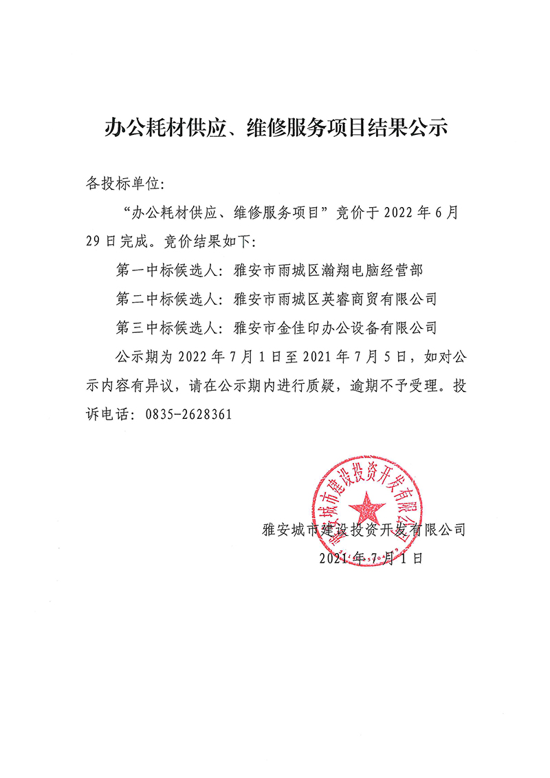 雅安城市建設(shè)投資開發(fā)有限公司 辦公耗材供應(yīng)、維修服務(wù)項(xiàng)目采購競價(jià)結(jié)果公示