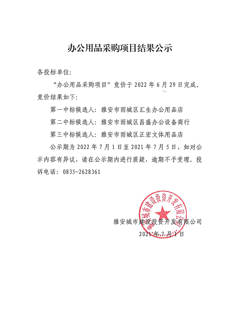 雅安城市建設(shè)投資開發(fā)有限公司辦公用品采購項(xiàng)目競價結(jié)果公示