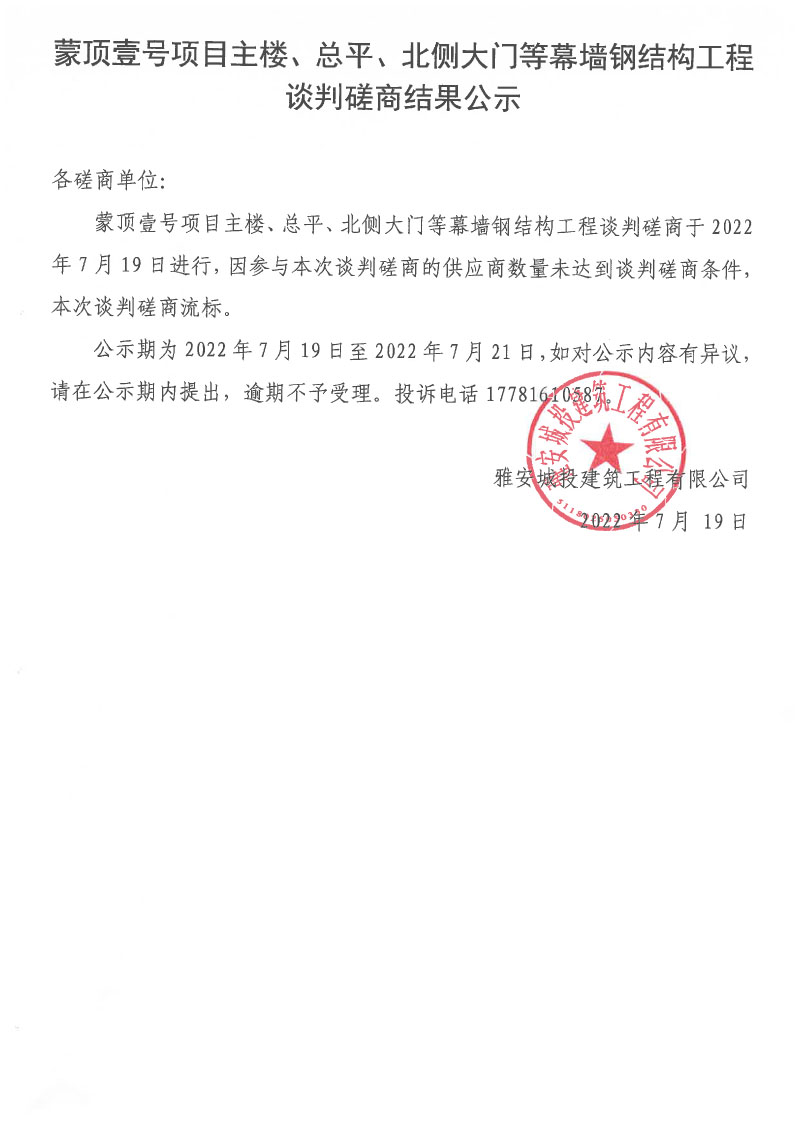 蒙頂壹號項目主樓、總坪、北側(cè)大門等幕墻鋼結(jié)構(gòu)工程談判磋商結(jié)果公示