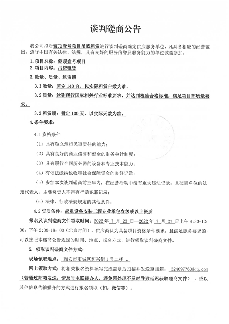 蒙頂壹號項目吊籃租賃談判磋商公告