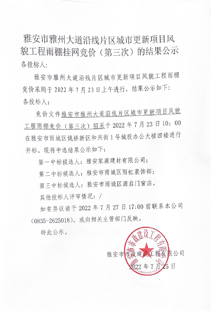 雅安市雅州大道沿線片區(qū)城市更新項(xiàng)目風(fēng)貌工程雨棚競(jìng)價(jià)(第三次)的結(jié)果公示