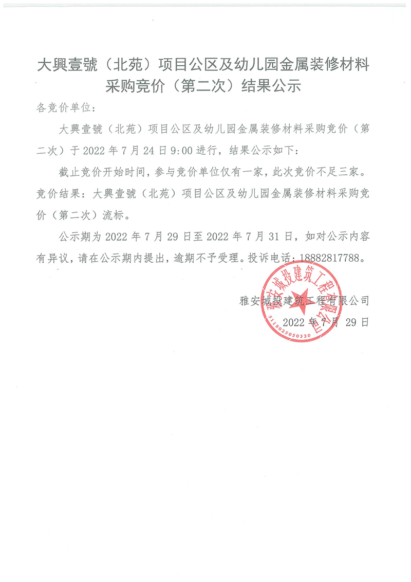 大興壹號(hào)(北苑)公區(qū)與幼兒園金屬裝修材料采購(gòu)競(jìng)價(jià)(第二次)結(jié)果公示