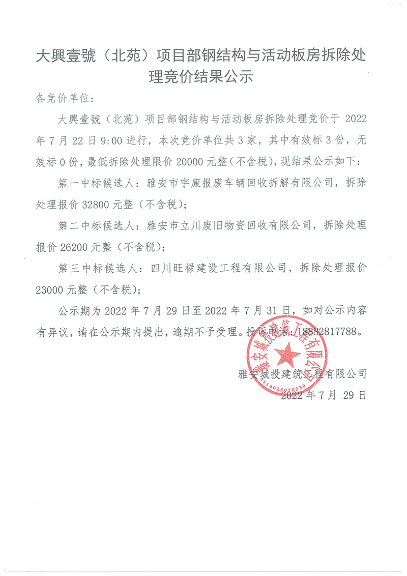 大興壹號(北苑)鋼結(jié)構(gòu)與活動板房拆除處理競價結(jié)果公示