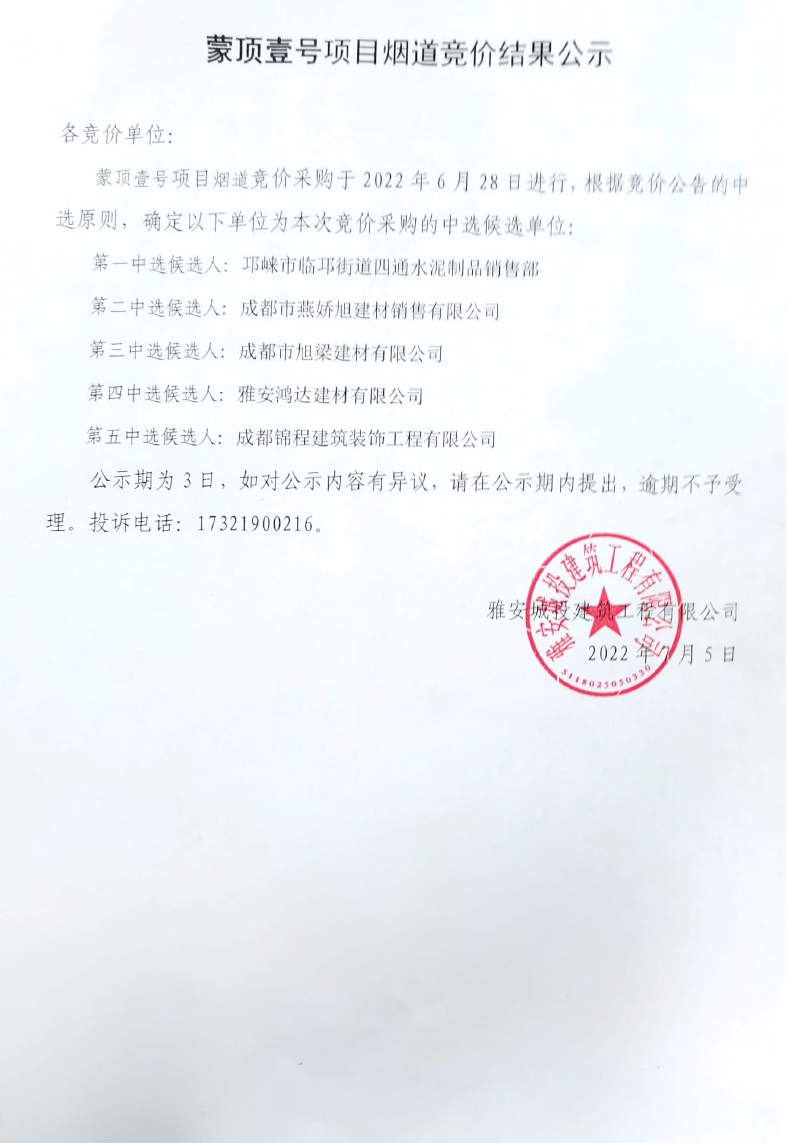 蒙頂壹號(hào)項(xiàng)目煙道采購(gòu)競(jìng)價(jià)結(jié)果公示