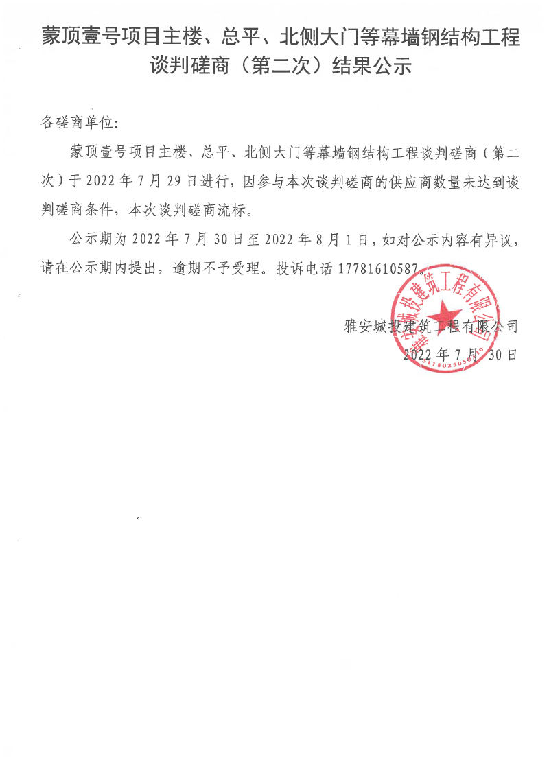 蒙頂壹號項目主樓、總坪、北側大門等幕墻鋼結構工程談判磋商(第二次)結果公示