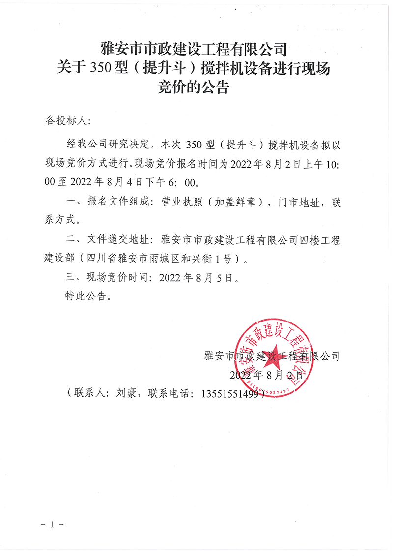 關(guān)于350型(提升斗)攪拌機(jī)設(shè)備進(jìn)行現(xiàn)場(chǎng)競(jìng)價(jià)的公告