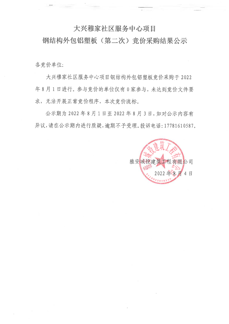 大興穆家社區(qū)服務(wù)中心項(xiàng)目鋼結(jié)構(gòu)外包鋁塑板(第二次)競(jìng)價(jià)采購(gòu)結(jié)果公示