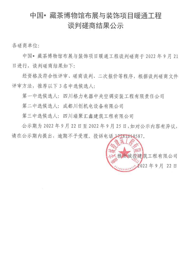 中國(guó)• 藏茶博物館布展與裝飾項(xiàng)目暖通工程談判磋商結(jié)果公示