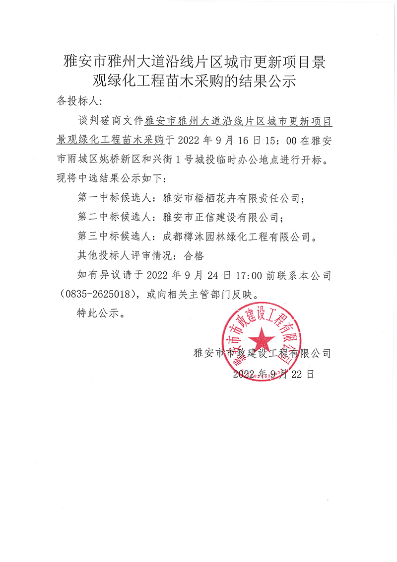 雅安市雅州大道沿線片區(qū)城市更新項目景觀綠化工程苗木采購的結果公示