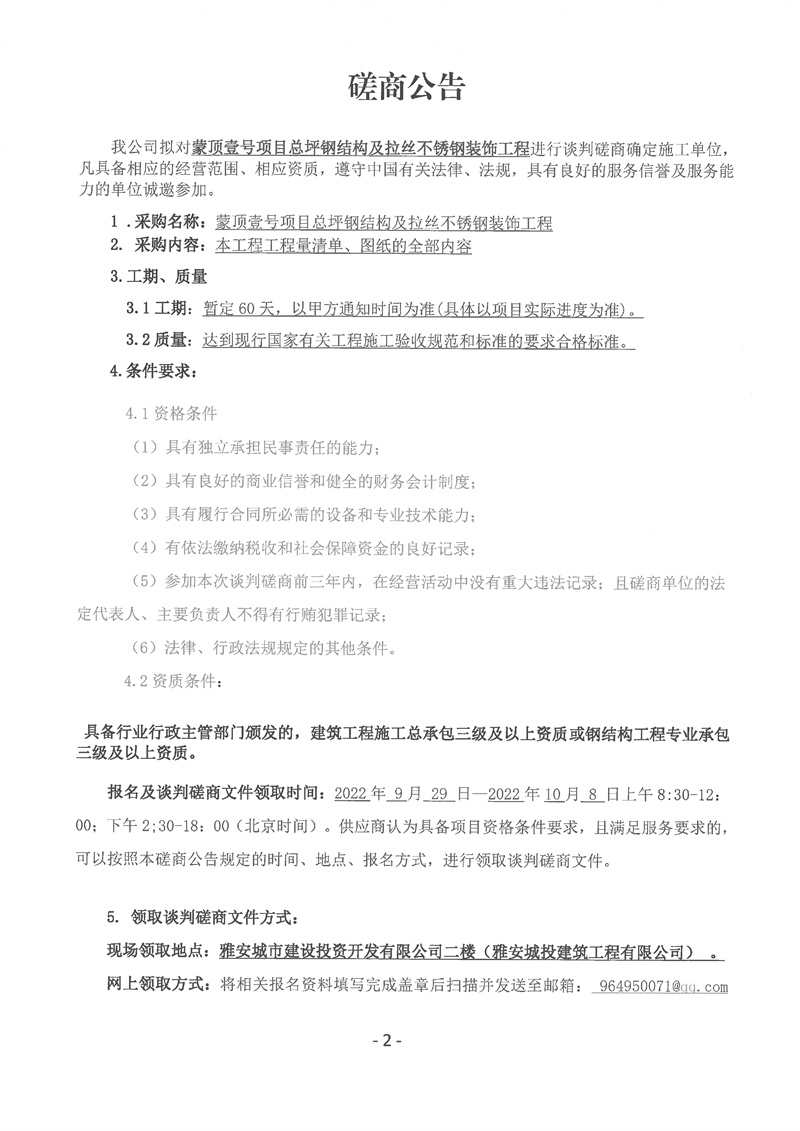 蒙頂壹號(hào)項(xiàng)目總坪鋼結(jié)構(gòu)及拉絲不銹鋼裝飾工程談判磋商公告