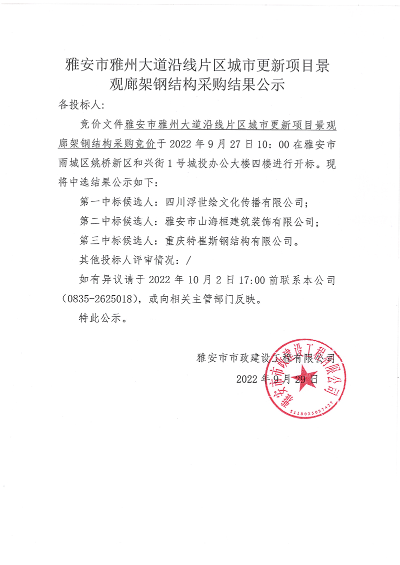 雅安市雅州大道沿線片區(qū)城市更新項(xiàng)目景觀廊架鋼結(jié)構(gòu)采購(gòu)結(jié)果公示