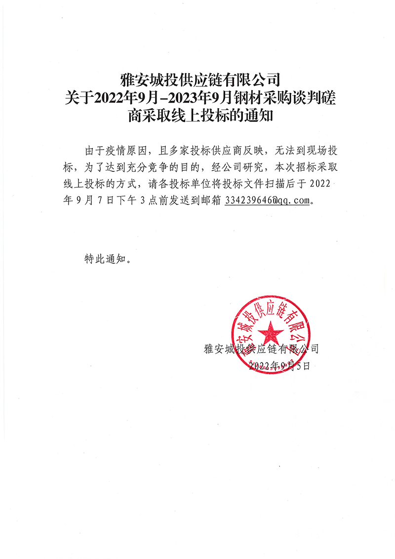 雅安城投供應(yīng)鏈有限公司關(guān)于2022年9月-2023年9月鋼材采購(gòu)談判磋商采取線(xiàn)上投標(biāo)的通知