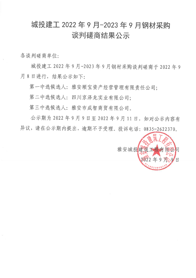 城投建工2022年9月-2023年9月鋼材采購(gòu)談判磋商結(jié)果公示