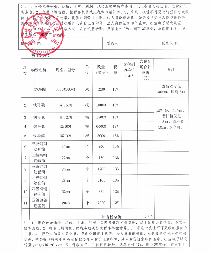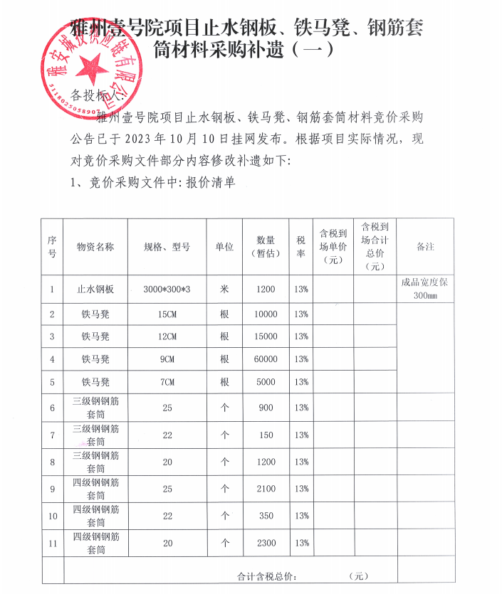 雅州壹號院項(xiàng)目止水鋼板、鐵馬凳、鋼筋套筒材料采購補(bǔ)遺(一)