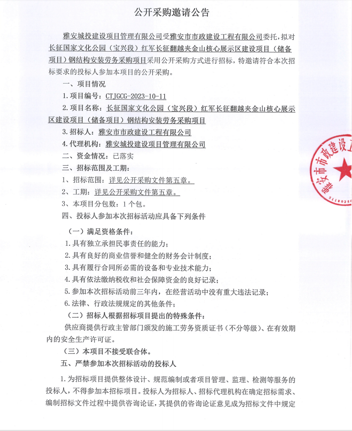 長(zhǎng)征國家文化公園(寶興段)紅軍長(zhǎng)征翻越夾金山核心展示區(qū)建設(shè)項(xiàng)目(儲(chǔ)備項(xiàng)目)鋼結(jié)構(gòu)安裝勞務(wù)采購項(xiàng)目公開采購邀請(qǐng)公告