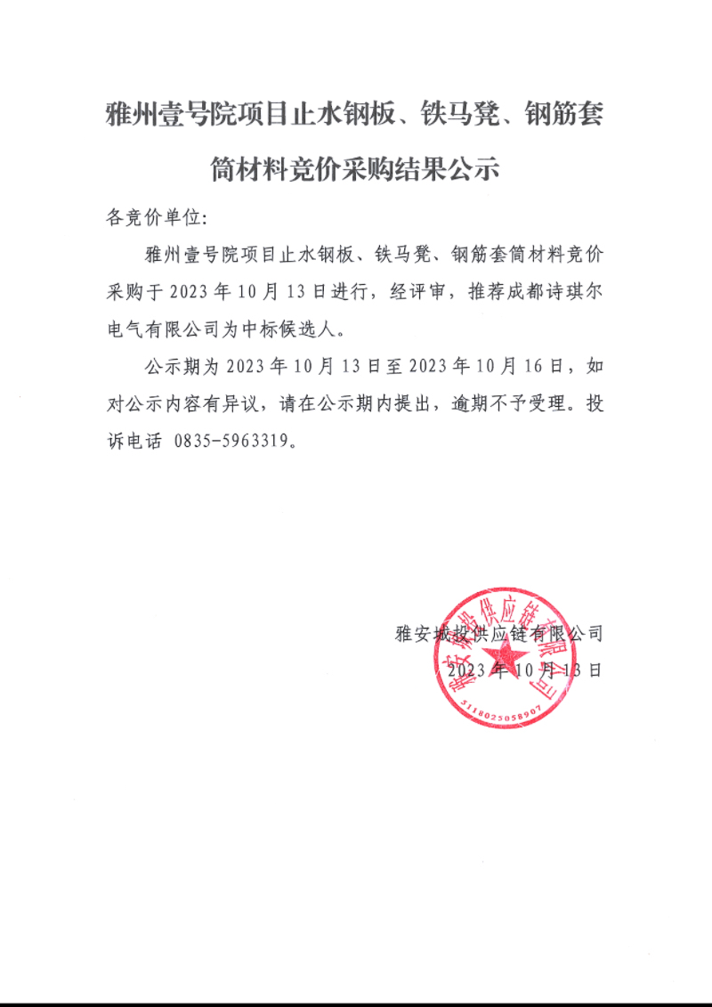 雅州壹號院項目止水鋼板、鐵馬凳、鋼筋套筒材料競價采購結(jié)果公示