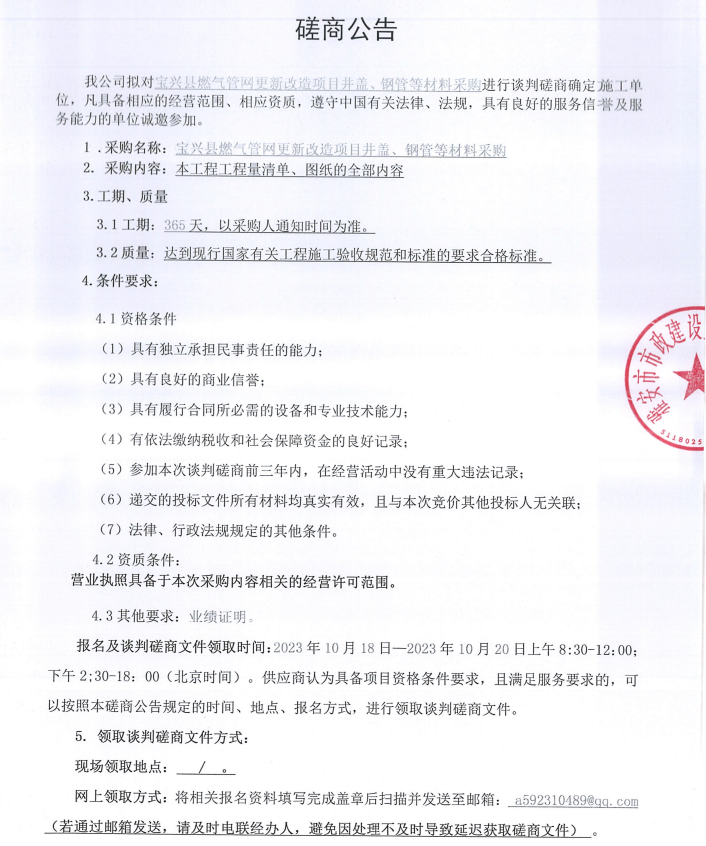 寶興縣燃?xì)夤芫W(wǎng)更新改造項(xiàng)目井蓋、鋼管等材料采購談判磋商公告