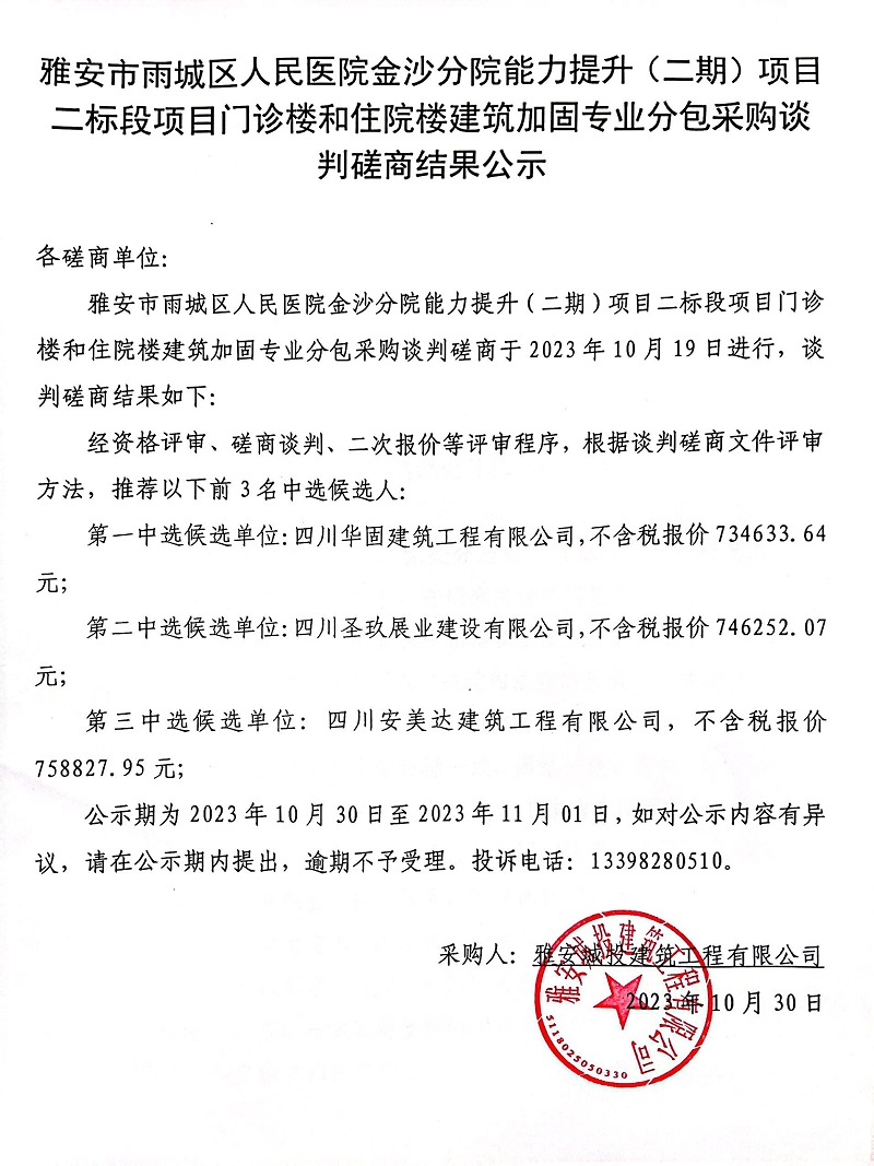 雅安市雨城區(qū)人民醫(yī)院金沙分院能力提升(二期)項目二標段門診樓和住院樓建筑加固專業(yè)分包采購談判磋商結果公示