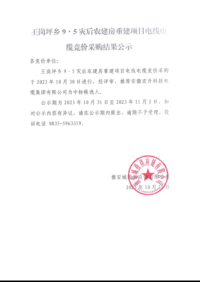 王崗坪鄉(xiāng)9.5災后農(nóng)建房重建項目電線電纜競價采購結(jié)果公示