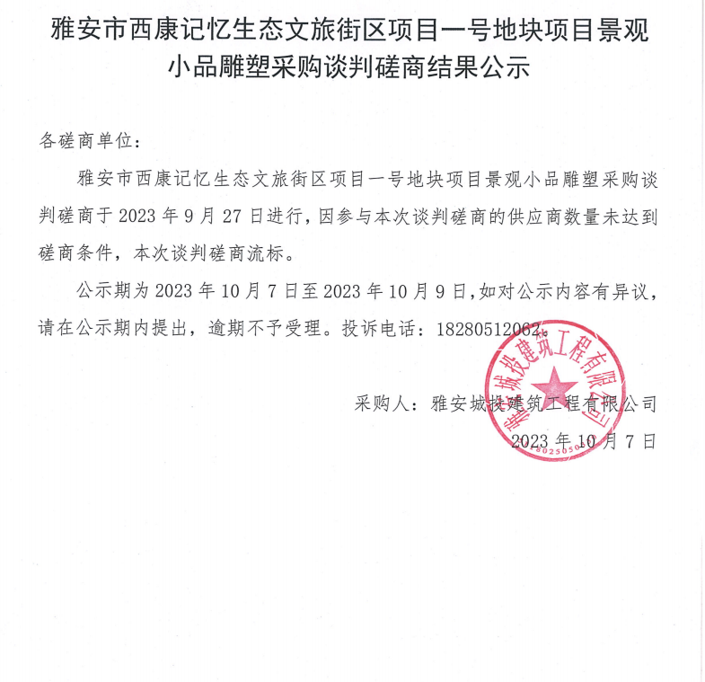 雅安市西康記憶生態(tài)文旅街區(qū)項(xiàng)目一號地塊項(xiàng)目景觀小品雕塑采購談判磋商結(jié)果公示
