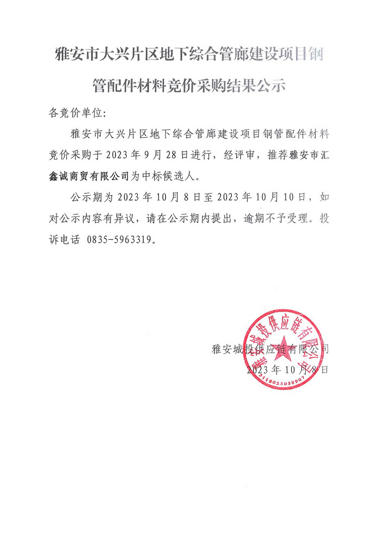 雅安市大興片區(qū)地下綜合管廊建設(shè)項目鋼管配件材料競價采購結(jié)果公示
