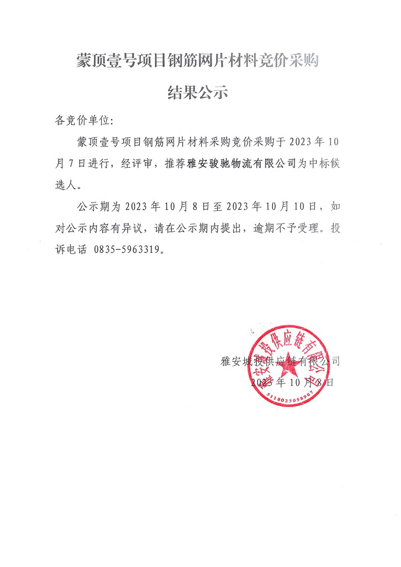 蒙頂壹號(hào)項(xiàng)目鋼筋網(wǎng)片材料競(jìng)價(jià)采購結(jié)果公示