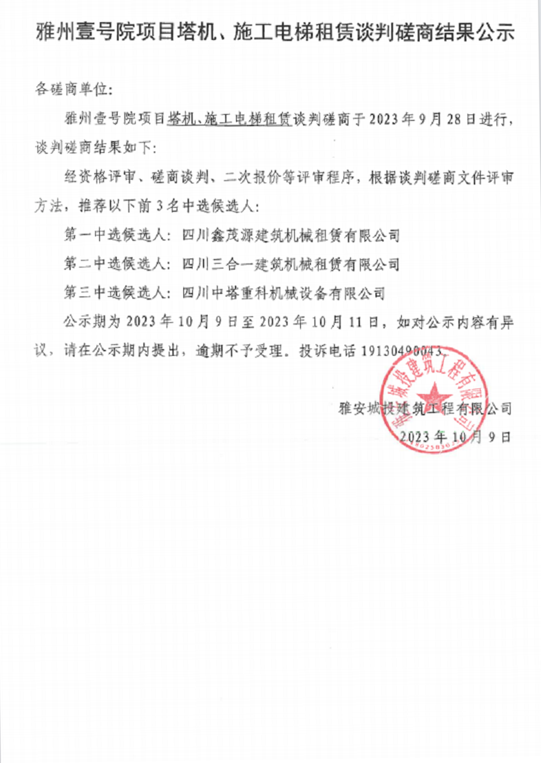 雅州壹號(hào)院項(xiàng)目塔機(jī)、施工電梯租賃談判磋商結(jié)果公示