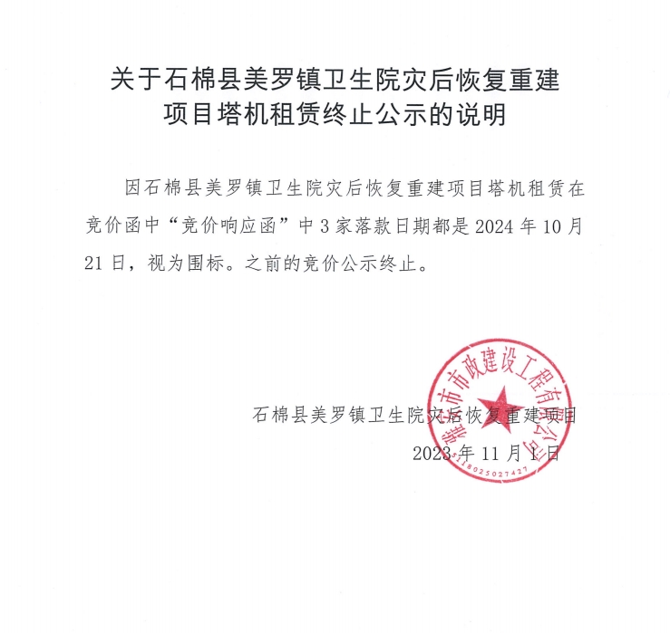 關(guān)于石棉縣美羅鎮(zhèn)衛(wèi)生院災(zāi)后恢復(fù)重建項(xiàng)目塔機(jī)租賃終止公示的說(shuō)明
