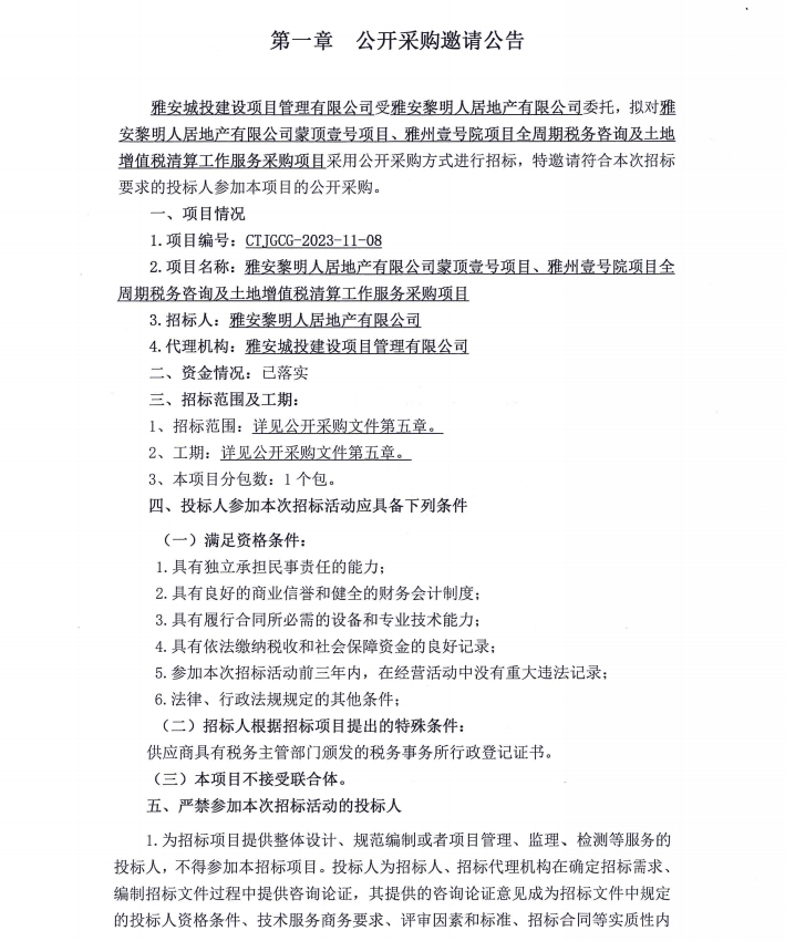 雅安黎明人居地產(chǎn)有限公司蒙頂壹號(hào)項(xiàng)目、雅州壹號(hào)院項(xiàng)目全周期稅務(wù)咨詢及土地增值稅清算工作服務(wù)采購(gòu)項(xiàng)目公開(kāi)采購(gòu)邀請(qǐng)公告