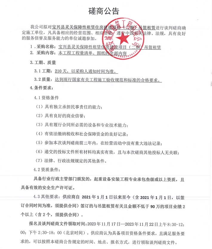寶興靈關(guān)保障性租賃住房建設(shè)項(xiàng)目(二期)吊籃租賃談判磋商公告