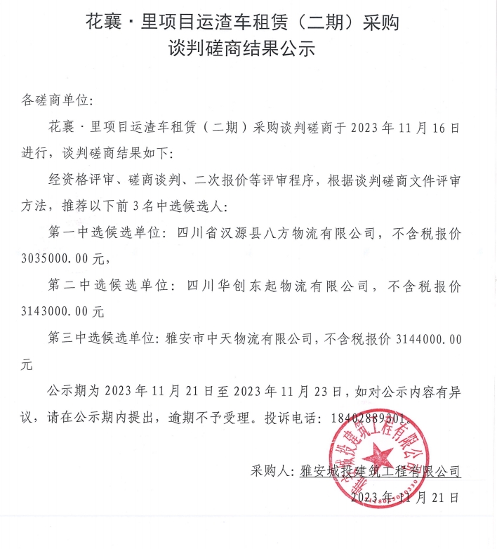 花襄·里項(xiàng)目運(yùn)渣車租賃(二期)采購(gòu)談判磋商結(jié)果公示