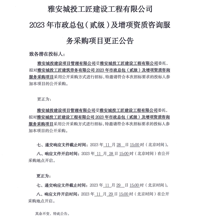 雅安城投工匠建設(shè)工程有限公司2023年市政總包(貳級)及增項資質(zhì)咨詢服務(wù)采購項目更正公告