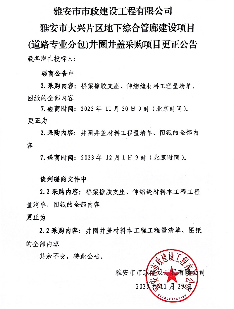 雅安市市政建設工程有限公司雅安市大興片區(qū)地下綜合管廊建設項目(道路專業(yè)分包)井圈井蓋采購項目更正公告