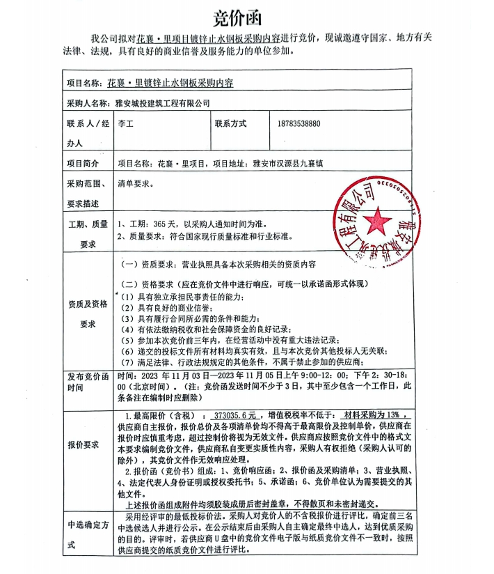 花襄·里項目鍍鋅止水鋼板采購內(nèi)容競價公告