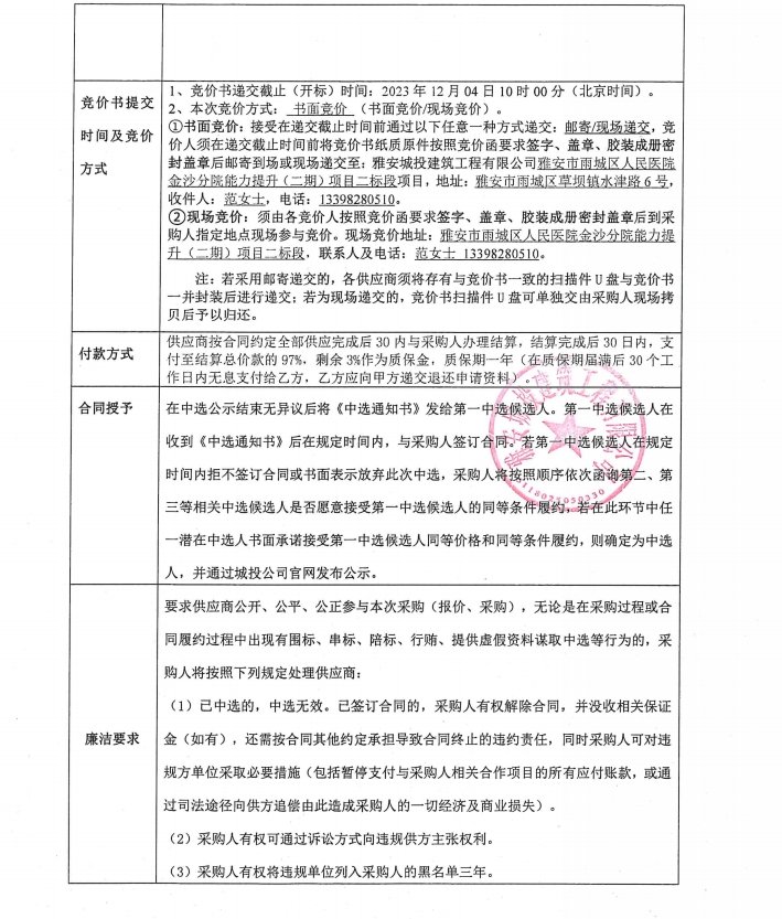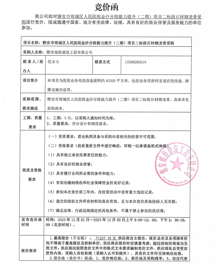 雅安市雨城區(qū)人民醫(yī)院金沙分院能力提升(二期)項目二標(biāo)段石材鋼龍骨采購競價公告