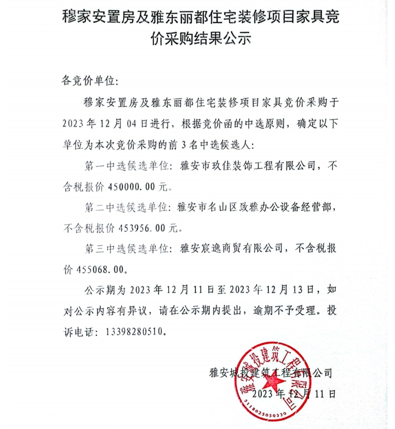 穆家安置房及雅東麗都住宅裝修項目家具采購競價采購結(jié)果公示