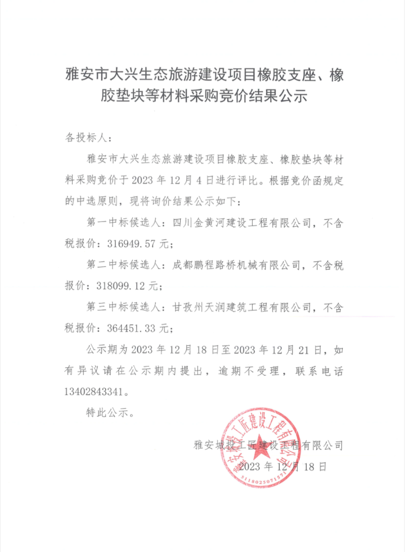 雅安市大興生態(tài)旅游建設項目橡膠支座、橡膠墊塊等材料采購競價結(jié)果公示