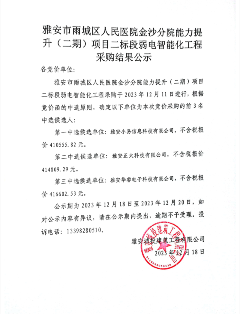 雅安市雨城區(qū)人民醫(yī)院金沙分院能力提升(二期)項目二標段弱電智能化工程采購結果公示