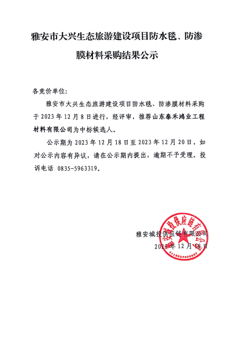 雅安市大興生態(tài)旅游建設(shè)項(xiàng)目防水毯、防滲膜材料采購(gòu)結(jié)果公示