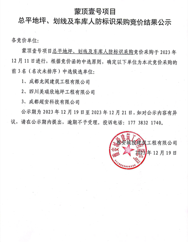 蒙頂壹號項(xiàng)目總平地坪、劃線及車庫人防標(biāo)識采購競價(jià)結(jié)果公示