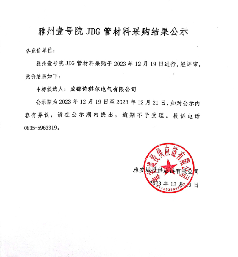 雅州壹號院JDG管材料采購結(jié)果公示