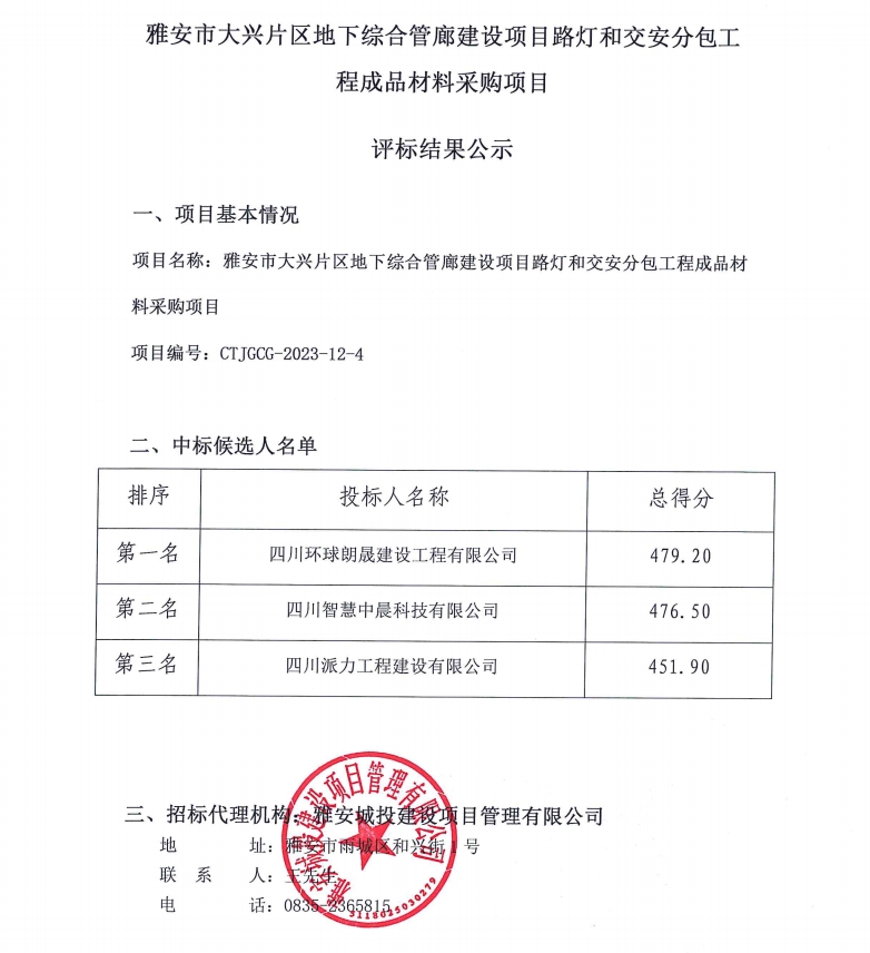 雅安市大興片區(qū)地下綜合管廊建設項目路燈和交安分包工程成品材料采購項目評標結果公示